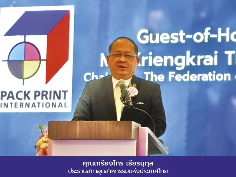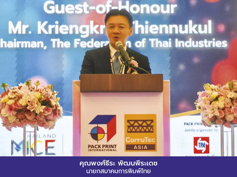 คุณเกรียงไกร เธียรนุกุล ประธานสภาอุตสาหกรรมแห่งประเทศไทย กล่าวว่า แม้เศรษฐกิจโลกยังเผชิญความผันผวนจากความตึงเครียดทางการค้าและประเด็นด้านภูมิรัฐศาสตร์ แต่ภูมิภาคเอเชียตะวันออกเฉียงใต้กลับถูกจับตามองเป็นศูนย์กลางการผลิตและการบริโภคแห่งใหม่ของโลก ด้วยมูลค่า GDP กว่า 4.25 ล้านล้านดอลลาร์สหรัฐ หรือราว 134 ล้านล้านบาท และประชากรกว่า 690 ล้านคน โดยประเทศไทยซึ่งตั้งอยู่ใจกลางภูมิภาค จึงมีบทบาทสำคัญในการเชื่อมโยงห่วงโซ่อุตสาหกรรมหลัก รวมถึง 3 อุตสาหกรรมยุทธศาสตร์ ได้แก่ การพิมพ์ บรรจุภัณฑ์ และบรรจุภัณฑ์กระดาษลูกฟูก ซึ่งกำลังกลายเป็นเครื่องยนต์ทางเศรษฐกิจเชื่อมโยงหลายตลาดตั้งแต่อุตสาหกรรมอาหาร เกษตรกรรม ยาและเวชภัณฑ์ FMCG ไปจนถึงอีคอมเมิร์ซและโลจิสติกส์ โดยความต้องการบรรจุภัณฑ์คุณภาพสูง บรรจุภัณฑ์ที่เป็นมิตรต่อสิ่งแวดล้อม และการลงทุนในเทคโนโลยีการพิมพ์อัจฉริยะที่เพิ่มขึ้นอย่างต่อเนื่อง ไม่ได้สะท้อนเพียงการพัฒนาอุตสาหกรรมเท่านั้น แต่ยังสะท้อนถึงโครงสร้างการบริโภคและกำลังซื้อของประชากรโลกที่กำลังเปลี่ยนแปลง ซึ่งผู้บริโภคยุคใหม่ต้องการสินค้าที่ปลอดภัย มีมาตรฐาน และใส่ใจสิ่งแวดล้อม อีกทั้งยังเป็นดัชนีชี้วัดเศรษฐกิจที่ชี้ทิศทางได้อย่างชัดเจนว่า ตลาดการค้าโลกกำลังเคลื่อนไปสู่ความต้องการสินค้ามูลค่าสูง เน้นคุณภาพ และให้ความสำคัญต่อสิ่งแวดล้อมมากขึ้น