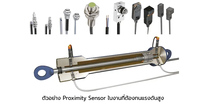 สำหรับงานที่ต้องการตรวจจับตำแหน่งของตัวแกนของกระบอกไฮโดรลิกนั้น จะใช้ Proximity Sensor แบบธรรมดาไม่ได้ เนื่องจากไม่สามารถทนต่อแรงดันภายในกระบอกลมหรือไฮโดรลิกได้ ดังนั้นการประยุกต์ใช้งาน Prox. สำหรับการตรวจจับตำแหน่งของกระบอกสูบชนิดนี้ เราสามารถใช้ตัว High Pressure Prox. ซึ่งสามารถทนต่อแรงดันได้สูงถึง 500 bar