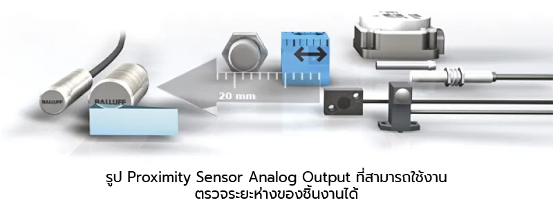 ซึ่ง Inductive Distance Sensor สัญญาณเอาท์พุทที่เป็นแบบอนาล็อก เช่น แรงดัน 0-10VDC. หรือกระแส 4-20mA. โดยจะแปรผันตามระยะห่างของวัตถุกับตัวเซ็นเซอร์ การใช้งานเซ็นเซอร์ประเภทนี้จะนิยมใช้ใน การเฝ้าดูระยะห่างของการเคลื่อนที่ หรือระยะการปั้มชิ้นงาน การล็อคชิ้นงาน หรือการดูความ Balance ของเครื่องจักรต่าง ๆ
