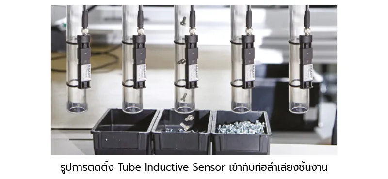 ในกระบวนการผลิต ที่มีการประกอบชิ้นส่วนต่าง ๆ มักจะมีการสำเลียงชิ้นส่วนขนาดเล็ก เข้ามายังเครื่องจักรหรือเป็นชิ้นส่วนที่ได้จากการผลิตโดยส่วนใหญ่จำเป็นต้องมีการนับจำนวนของชิ้นส่วนเหล่านั้นผ่านทางท่อที่ลำเลียง หากใช้ Proximity Sensor แบบธรรมดา นั้นอาจก่อให้เกิดปัญหาในการติดตั้ง อีกทั้งเรื่องของความเร็วในการตรวจนับชิ้นงาน อาจเกิดการนับไม่ทัน จึงได้มีการพัฒนา Inductive Tube Sensor ขึ้นมาเพื่อใช้ในงานประเภทนี้โดยเฉพาะ ซึ่งจะออกแบบให้มีการติดตั้งที่เข้ากับตัวท่อลำเลียงได้โดยง่ายและมีความเร็วในการตรวจจับชิ้นงานมากขึ้น โดยความเร็วสูงที่สามารถตรวจจับได้สูงถึง 20m/s