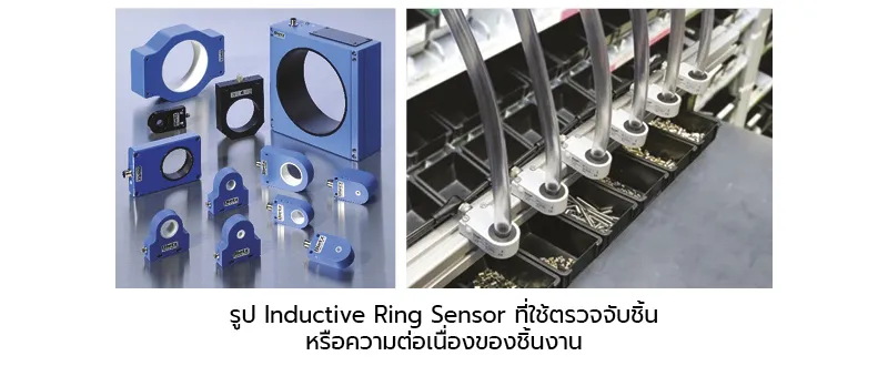 สำหรับงานที่ต้องการตรวจจับชิ้นงานที่มีลักษณะตกลงมา หรือการตรวจจับความต่อเนื่องของชิ้นงาน เช่น สายไฟ การใช้งานตัว Proximity Sensor แบบธรรมดา อาจเกิดความยุ่งยากในการติดตั้ง ปัจจุบันจึงมี Proximity Inductive Ring Sensor ที่มีโครงสร้างเป็นแบบรูตรงกลางเพื่อให้วัตถุหรือชิ้นงานที่ต้องการตรวจจับรอดผ่านมาเพื่อนับจำนวนต่อไป