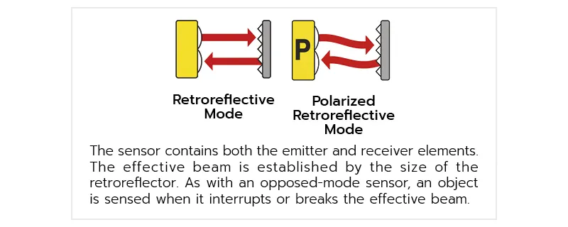 เซ็นเซอร์แบบนี้จะมีช่วงในการทำงานหรือระยะในการตรวจจับจะได้ใกล้กว่าแบบ Opposed mode ซึ่งในสภาวะการทำงานปกติตัวรับ Receiver จะสามารถรับสัญญาณแสงจากตัวส่ง Emitter ได้ตลอดเวลา เนื่องจากลำแสงจะสะท้อนกับแผ่นสะท้อน Reflector อยู่ตลอดเวลา