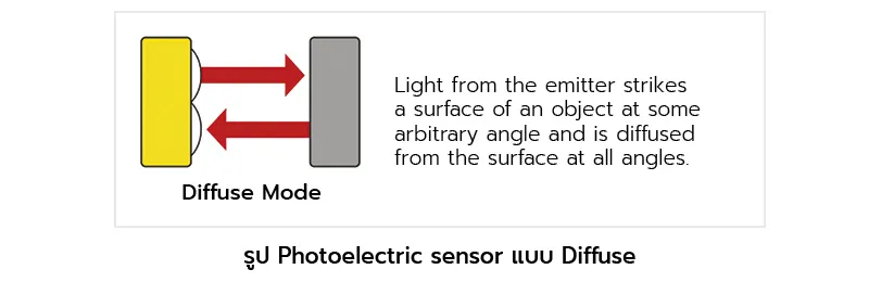 เป็นโหมดการทำงานพื้นฐานสุดของ Photoelectric sensor แบบ Diffuse mode ซึ่งแสงที่ส่งออกจากตัว Emitter นั้น จะทำมุมกับตัวเซ็นเซอร์เอง แต่ตัวรับหรือ Receiver นั้นจะรับเฉพาะแสงที่สะท้อนกับวัตถุแล้วส่งกลับมาตั้งฉากกับตัวรับเท่านั้น ซึ่งการทำงานแบบนี้ ในเรื่องของสี ขนาด และความสว่างของวัตถุ มีผลต่อระยะทางในการตรวจจับทั้งสิ้น