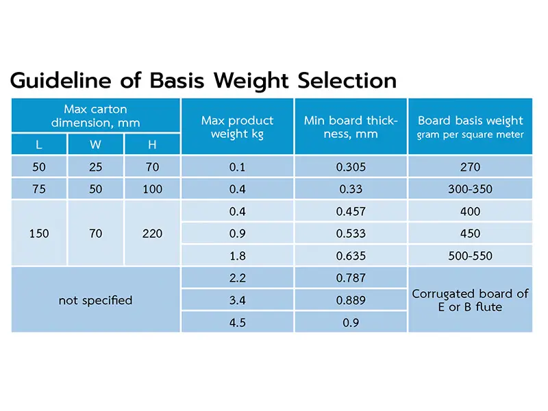 นอกจากการเลือกชนิดกระดาษแล้ว ยังต้องเลือกน้ำหนักมาตรฐานของกระดาษโดยพิจารณาจากขนาดของกล่องและน้ำหนักของผลิตภัณฑ์ที่บรรจุ กล่องขนาดใหญ่และผลิตภัณฑ์มีน้ำหนักมากต้องใช้กระดาษที่มีน้ำหนักมาตรฐานสูงขึ้น เพื่อให้สามารถรับน้ำหนักสินค้าได้ และป้องกันกล่องเสียรูปในระหว่างการจัดจำหน่าย การเลือกน้ำหนักมาตรฐานของกระดาษอาจใช้ข้อแนะนำดังตารางต่อไปนี้