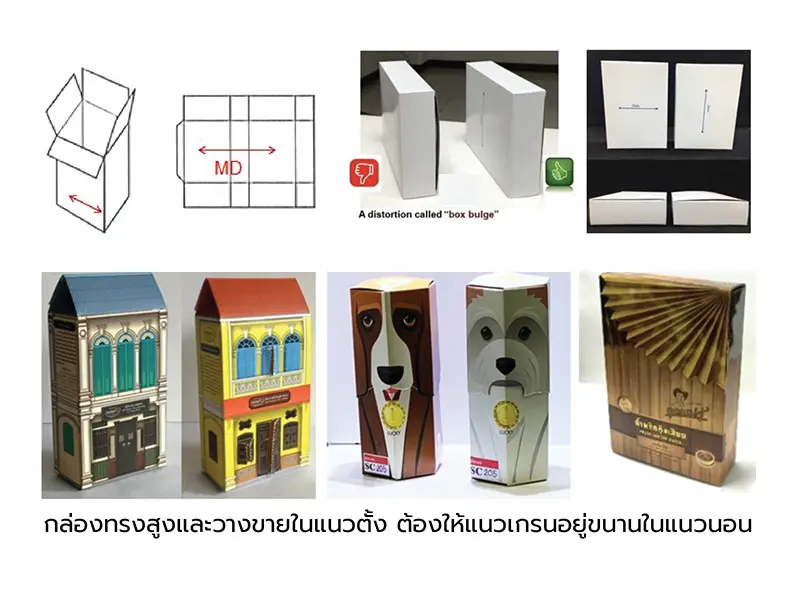 ต้องพิจารณาแนวเกรน (MD) ของกระดาษ หากเป็นกล่องทรงสูงและวางขายในแนวตั้ง ต้องให้แนวเกรนอยู่ขนานในแนวนอน เพื่อป้องกันกล่องป่อง (box bulge) เมื่ออยู่บนชั้นวางขายเป็นเวลานาน หากเป็นกล่องทรงเตี้ย แนวเกรนจะอยู่ในแนวนอนหรือตั้งก็ได้ ขึ้นกับว่าวางแนวใดที่สามารถให้จำนวนกล่องบนชั้นวางขายได้มากกว่า