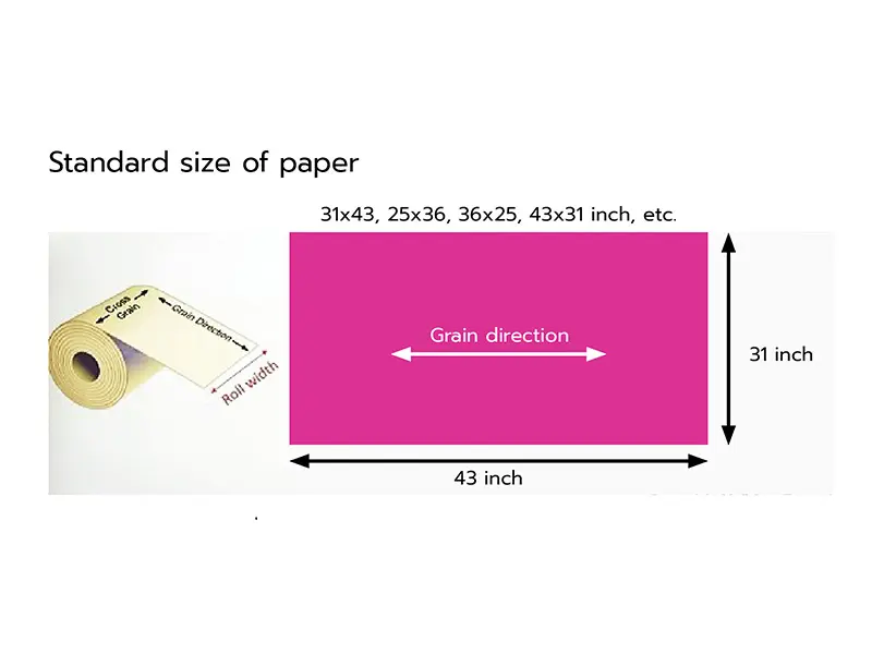 ในประเทศไทยอุตสาหกรรมผลิตกระดาษนิยมระบุขนาดกระดาษเป็นหน่วยของนิ้ว เริ่มด้วยความยาวตามแนวขวางเครื่อง (CD) แล้วตามด้วยควายาวในแนวขนานเครื่อง (MD) เช่น ขนาดกระดาษมาตรฐาน 31×43 นิ้ว หมายถึง ความยาวในแนว CD เป็น 31 นิ้ว ในแนว MD เป็น 43 นิ้ว ดังรูป หากลูกค้าต้องการขนาดกระดาษที่ต่างไปจากขนาดมาตรฐานนี้ ลูกค้าต้องทำการตกลงเฉพาะกับผู้ผลิตกระดาษ ถ้ามีปริมาณการสั่งซื้อที่สูงและสามารถจัดแบ่งหน้ากระดาษลงกับเครื่องผลิตได้ ผู้ผลิตกระดาษอาจจะผลิตให้ได้