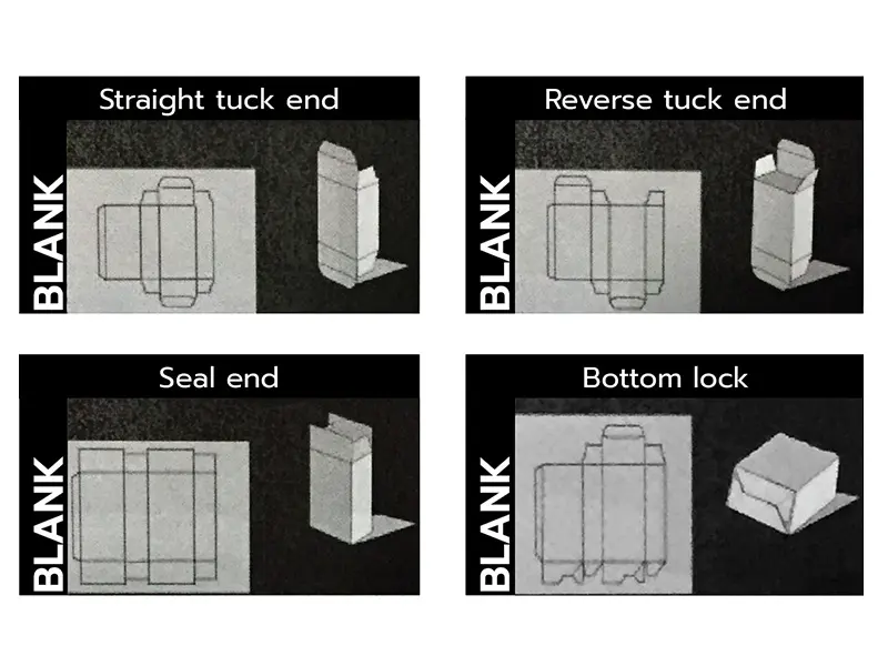 กล่องมีหลายแบบ โดยมีชื่อเรียกเฉพาะ แต่ละแบบมีแผ่นคลี่ (เรียกว่า Blank) ต่างกัน ซึ่งมีผลต่อการวาง layout ของกล่องบนแผ่นกระดาษมาตรฐาน ตัวอย่างแบบกล่องที่นิยมใช้และแผ่นคลี่ ดังรูป