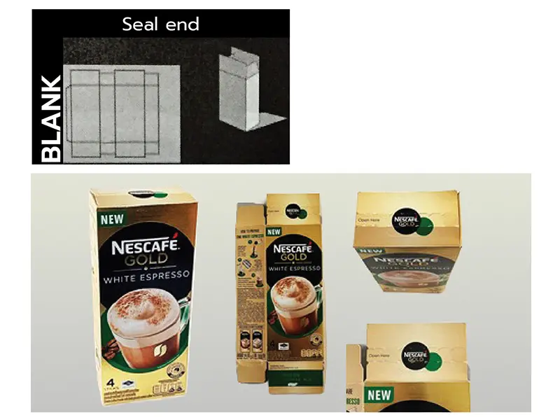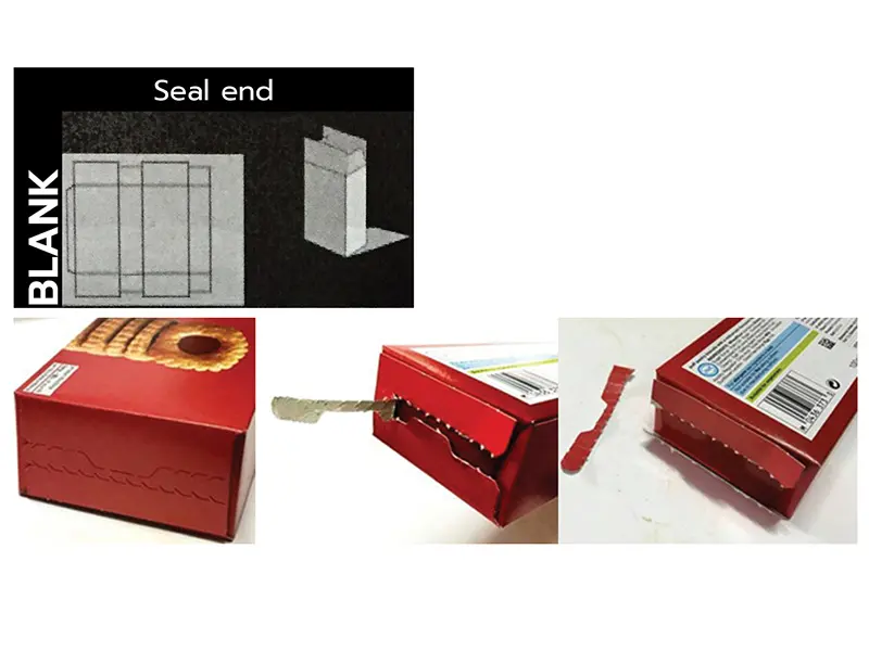 แบบกล่องที่แนะนำสำหรับอาหาร คือ กล่องแบบฝาติดกาวทั้งฝาบนและฝาล่าง เพื่อสามารถทิ้งร่องรอยให้เห็นเมื่อถูกเปิด (Tamper Evidence) ช่วยสร้างความเชื่อมั่นในความสะอาดของโรงงานผลิตว่าได้ป้องกันสิ่งแปลกปลอมลงไปในกล่อง อันจะช่วยส่งเสริมตราสินค้าได้ทางหนึ่ง กล่องแบบนี้ควรมีการทำรอยปรุที่ฝาและควบคุมปริมาณกาวที่ใช้และตำแหน่งการทากาวให้เหมาะสม เพื่อให้ฝากล่องฉีกเปิดได้ง่ายตามแนวรอยปรุโดยไม่ต้องใช้อุปกรณ์ใดๆ ดังรูป