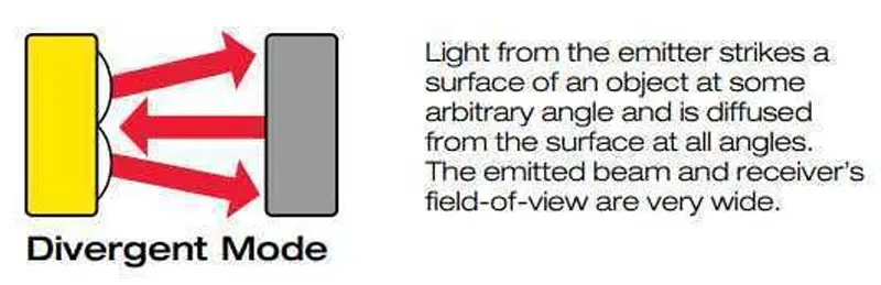 แต่สำหรับ Divergent นั้น จะอาศัยหลักการทำงานโดยการลดย่านในการตรวจจับให้สั้นลง เพื่อให้สามารถตรวจจับวัตถุที่มีความมันวาวได้ โดยจะทำให้เกิดการกระจายแสง หรือสะท้อนกลับของแสงแบบกระจาย แต่จะมีแสงบางส่วนเท่านั้นที่สะท้อนมาตรงกับตัวเซ็นเซอร์ ซึ่งเป็นผลทำให้ให้ระยะในการตรวจจับสั้นลง